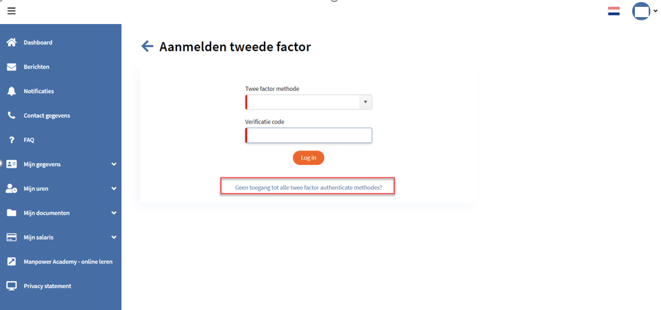 (2FA1) Log in en klik op “Geen toegang tot alle twee factor authenticatie methodes?”