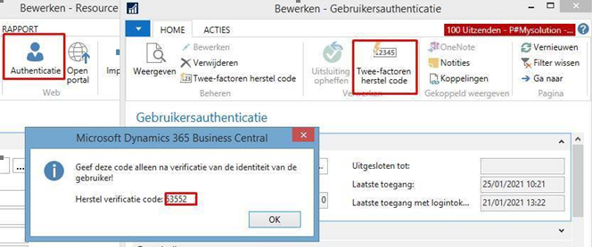 Eerst haal je in MSF de herstelcode op, dit doe je op de resourcekaart met het knopje "Authenticatie". Vervolgens klik je op "Twee-factoren herstel code"